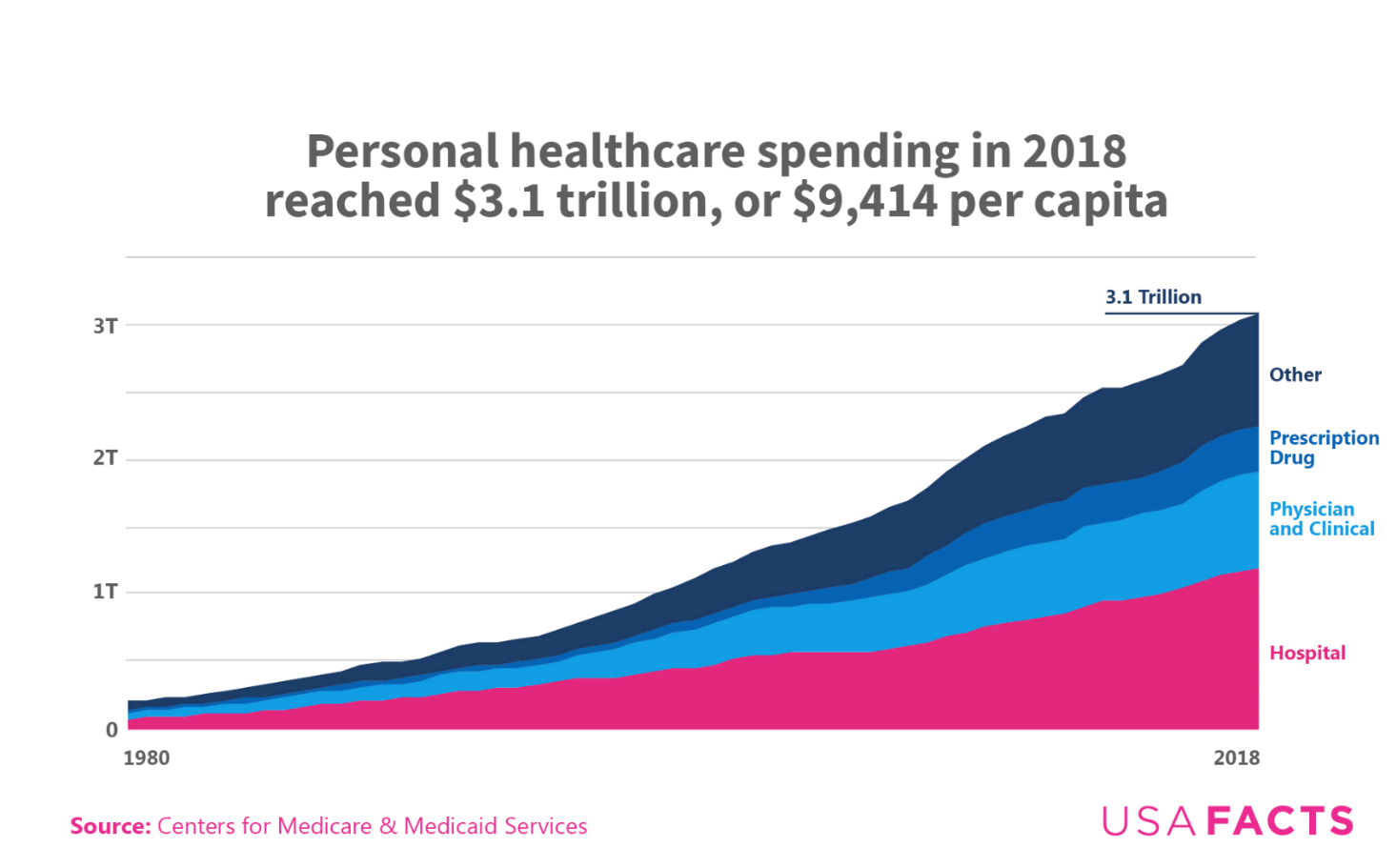 In 2018, personal healthcare nationwide spending was $3.1 trillion, which was roughly 15% of the nation’s gross domestic product. At approximately $9,414 per capita per person, healthcare costs were more than three times what they were in 1980 (adjusted for inflation). Healthcare costs are growing faster than the US population or general inflation.