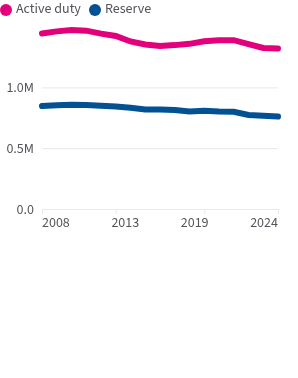 The largest category of defense spending in FY 2024 was operation and maintenance: at $332.0 billion, it made up 38.0% of defense spending. This was followed by compensation for military personnel with $191.9 billion, or 22.0% of spending to pay the 2.1 million active duty and reserve troops (counted on June 2025). Combined, these categories accounted for 60.0% ($524.0 billion) of the total national defense budget.